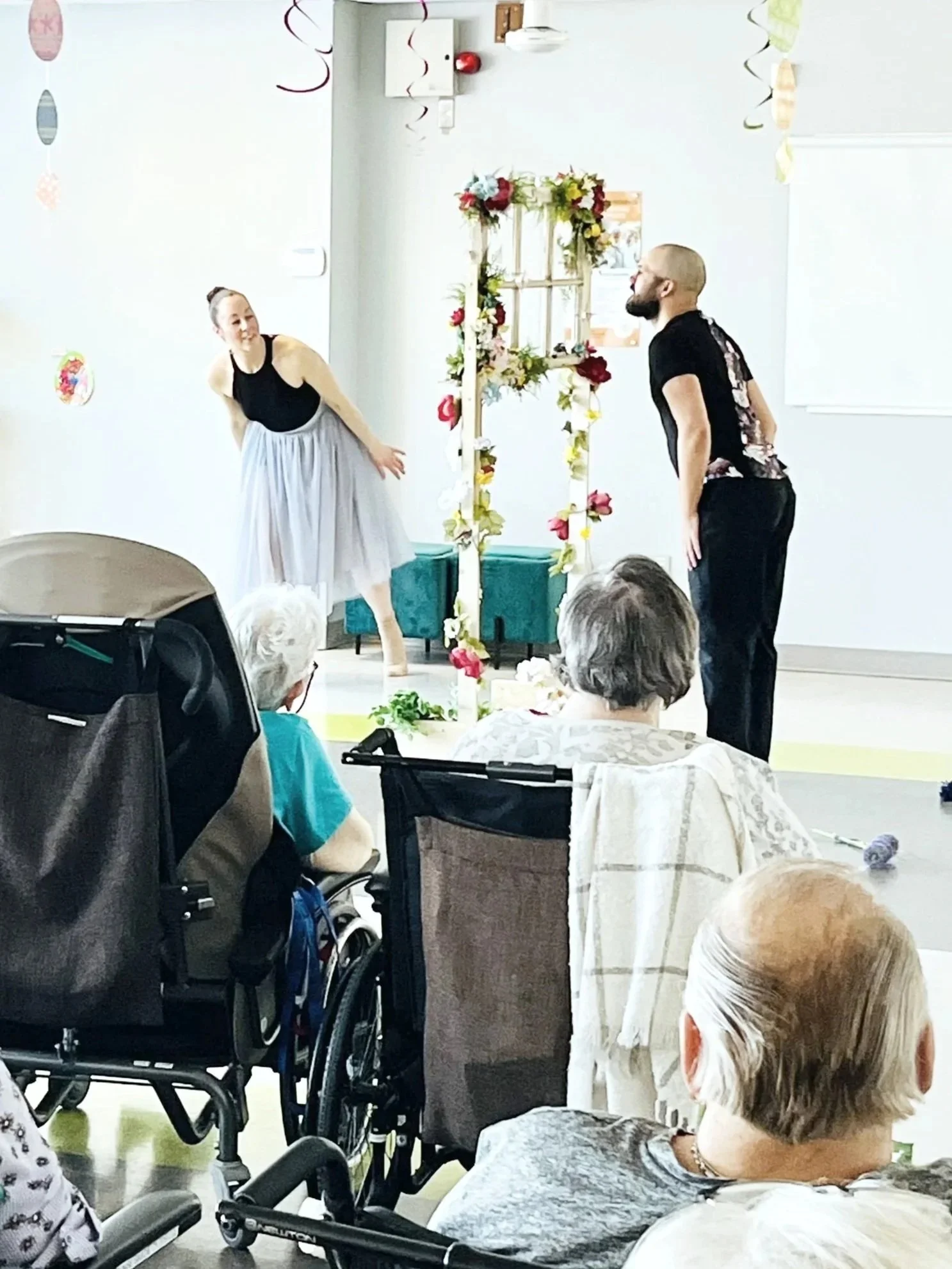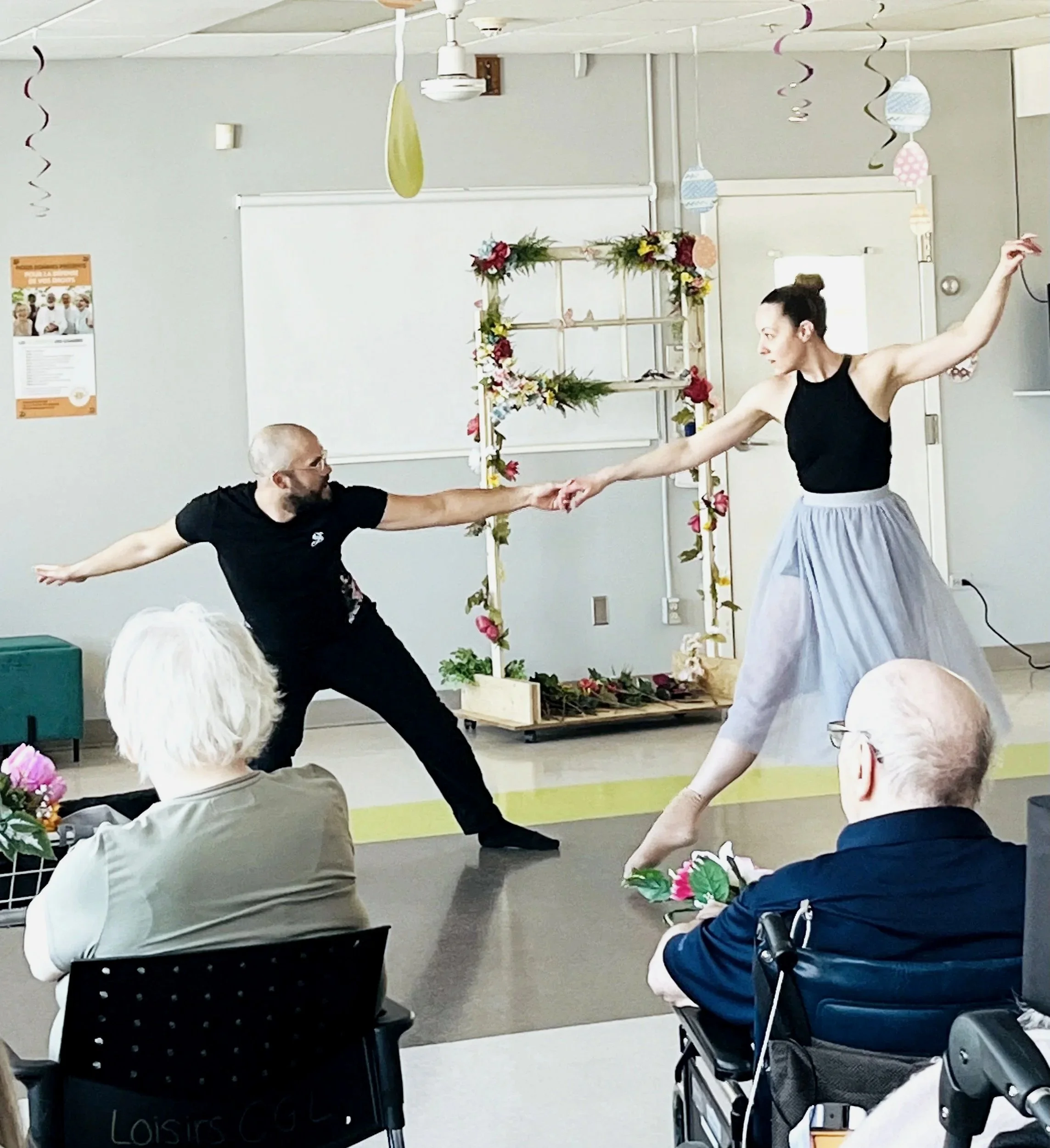 Avec une scénographie facilement transportable, ce duo d’une durée de 30 min s’adapte aux différentes salles disponibles en CHSLD/RPA.