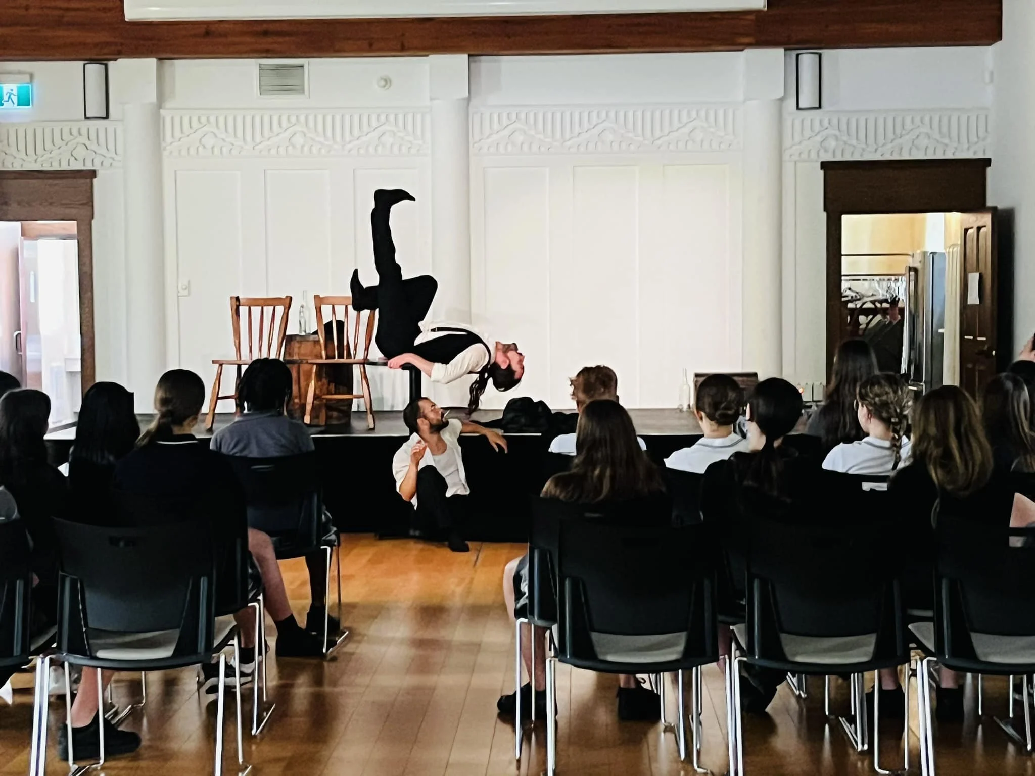 Inspiré de la scénographie de notre spectacle Folies passagères, dans l’univers des années folles, les jeunes sont amenés à expérimenter le duo à l’aide d’accessoires.