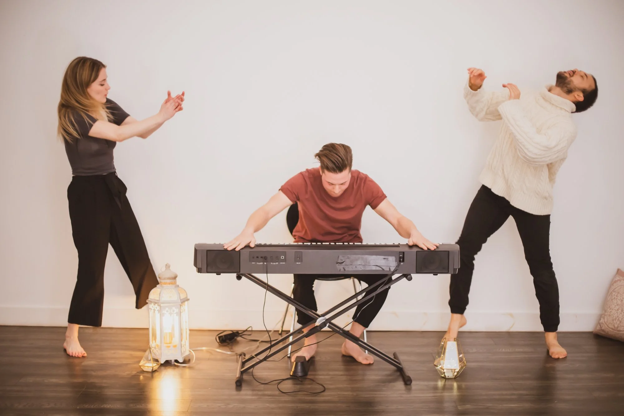 Par une improvisation de longue durée influencée par les spectateurs, la pièce se déploie devant nos yeux, tels une étincelle qui devient flamme, puis feu rassembleur.